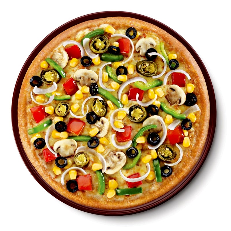 A pizza that decidedly staggers under an overload of golden corn, exotic black olives, crunchy onions, crisp capsicum, succulent mushrooms, juicy fresh tomatoes and jalapeno – with extra cheese to go all around.